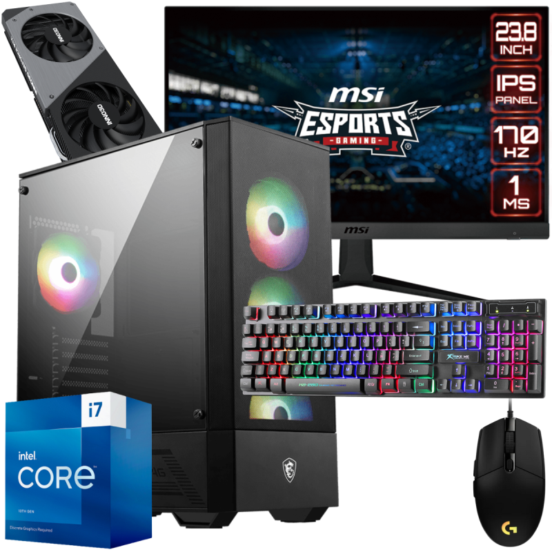 Écran Gaming MSI G2412 24" Full HD IPS / 170 Hz - Boîtier Gamer MSI MAG FORGE 112R - Processeur Intel Core i7-13700F 13e génération, up to 5.2 GHz, 30 Mo de mémoire cache - RAM 32 Go (2x 16 Go) Patriot Viper Steel DIMM DDR4 CL20 RGB - Disque SSD 512 Go 2.5" SATA III - Carte Graphique INNO3D GEFORCE RTX 4060 TWIN X2, 8 Go de mémoire GDDR6 dédiée - Carte mère MSI PRO B760M-P DDR4 - Kit de Watercooling pour processeur MSI MAG CORELIQUID 240R V2 / ARGB - Boite d'alimentation modulaire AeroCool 80PLUS Gold / 750W / RGB - Souris Gaming Logitech G102 Prodigy / Noir - Clavier Gaming Xtrike Me KB-280 / RGB / Noir - Garantie 1 an