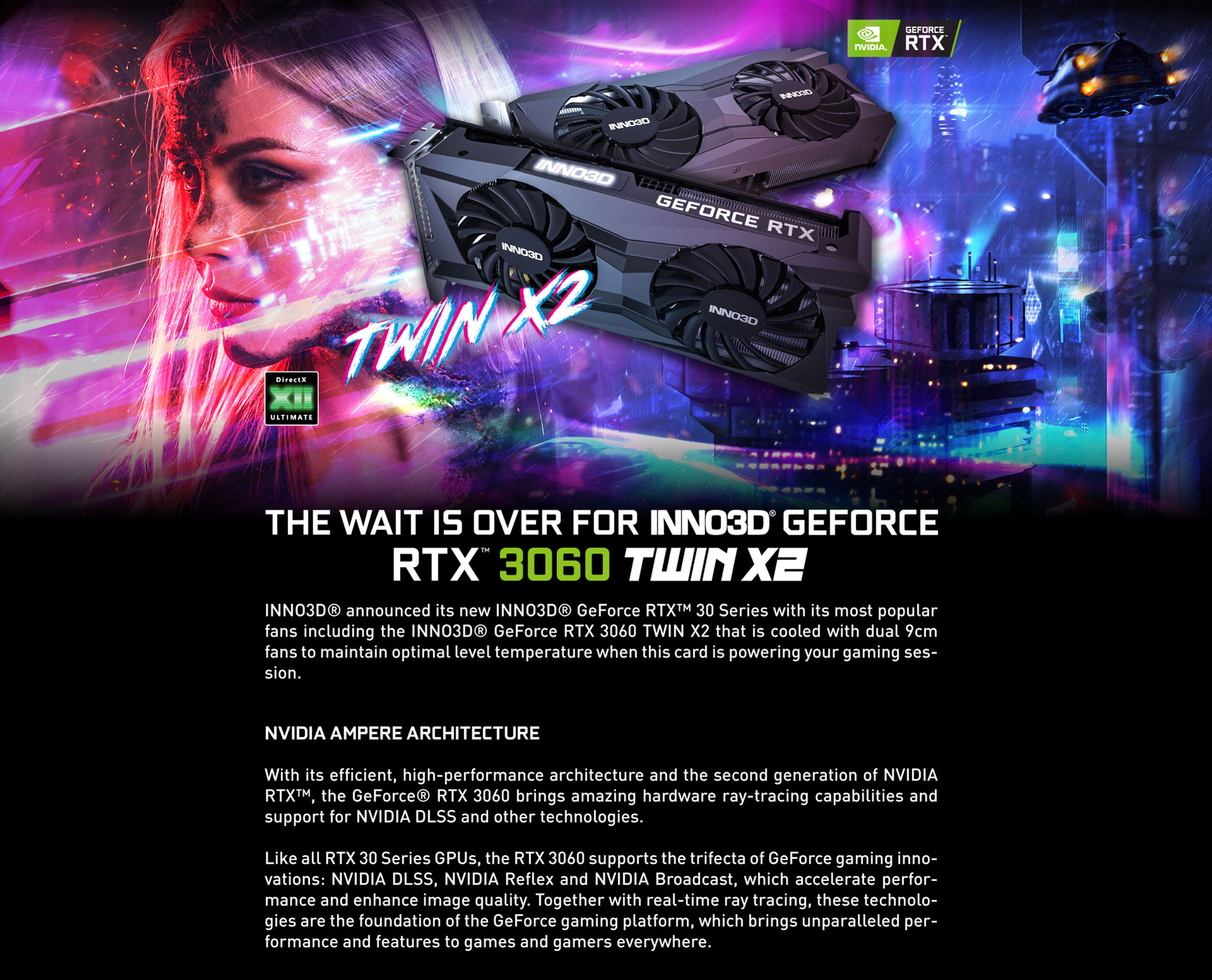 Avec le modèle GeForce RTX 3060, NVIDIA rend encore plus accessibles les performances de haute volée proposées par les cartes graphiques Ampère. Des graphismes sublimés, une fluidité remarquable et un réalisme incroyable vous permettront de profiter au mieux des jeux PC les plus récents. Il ne vous reste plus qu'à plonger au coeur de l'action et à vous immerger totalement dans la partie. La carte graphique INNO3D GeForce RTX 3060 TWIN X2 LHR embarque 12 Go de mémoire vidéo de nouvelle génération GDDR6. Ce modèle bénéficie de fréquences de fonctionnement élevées et d'un système de refroidissement amélioré gage de fiabilité et de performances à long terme.