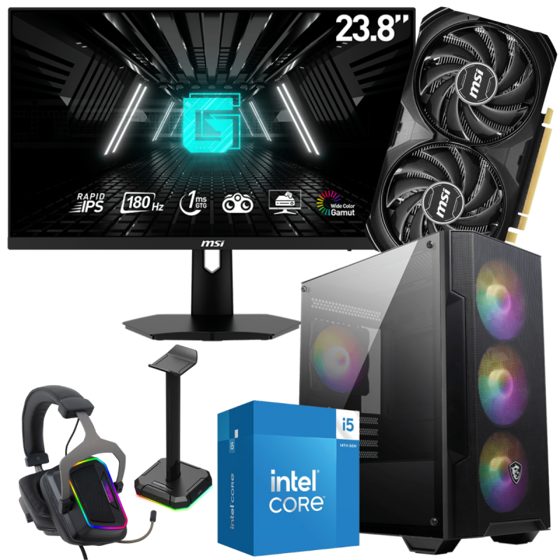 Écran Gaming MSI G244F E2 24" Full HD IPS / 180 Hz / Noir- Boîtier Gamer MSI MAG FORGE M100A - Processeur Intel Core i5-14400F 14e génération, (jusqu'à 4.7 GHz, 20 Mo de mémoire cache) - RAM 16 Go (2x 8 Go) DDR4 - Disque SSD 2.5" SATA 500 Go - Carte graphique MSI GeForce RTX 4060 Ti VENTUS 2X OC Black, 8 Go de mémoire GDDR6 dédiée - Carte mére MSI PRO H610M-E DDR4 - Boite d'alimentation modulaire AeroCool 80PLUS Gold / 650W / RGB - Casque Micro USB Gaming Patriot Viper V380 7.1 Surround / RGB + Support pour Casque Redragon HA300 SCEPTER Pro - Garantie 1 an