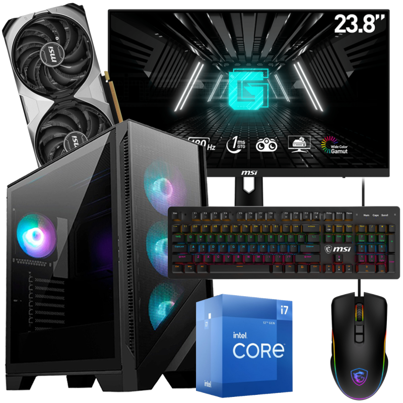 Écran gaming MSI G244F E2 24" Full HD IPS / 180 Hz / Noir - Boîtier Gamer Moyen Tour MSI MAG FORGE 320R AIRFLOW - Processeur Intel Core i7-12700 12e génération, (jusqu'à 4.9 GHz, 25 Mo de mémoire cache) - RAM 16 Go (2x 8 Go) Mushkin Redline Lumina DDR4 / 3600 MHz / RGB - Disque SSD MSI SPATIUM M390 M.2 NVMe 500 Go - Carte graphique MSI GeForce RTX 4070 VENTUS 2X E OC, 12 Go de mémoire GDDR6X dédiée - Carte mère MSI PRO B760M-P DDR4 - Boîte d'alimentation MSI MAG A750BN PCIE5 / 750W / 80 PLUS Bronze - Souris gaming Filaire MSI FORGER GM300 / Noir + Clavier gaming mécanique MSI FORGE GK300 / Blue Switches / RGB / Noir - Garantie 1 an