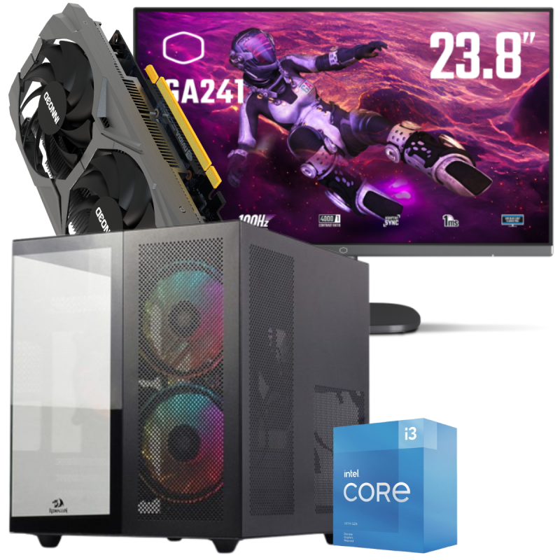 Écran Gaming Cooler Master GA241 24" Full HD VA / 100 Hz - Boîtier Gamer REDRAGON PAGOS 2 GC-580 M-ATX / 3 FAN ARGB / Noir - Processeur Intel Core i3-10105F 10e génération, (jusqu'à 4.4 GHz, 6 Mo de mémoire cache) - RAM 16 Go (2x 8 Go) DDR4 - Disque SSD 2.5" SATA 512 Go - Carte Graphique INNO3D GEFORCE GTX 1650 GDDR6 TWIN X2 OC V3, 4 Go de mémoire GDDR6 dédiée - Carte mère Asus Prime H510M-K - Boîte d'alimentation MSI MAG A500N-H / 500 W - Avec ENSEMBLE CLAVIER ET SOURIS GAMER FILAIRE STAR WAVE GCM1088 RGB / NOIR - Garantie 1 an