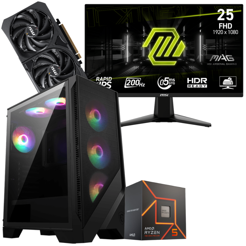 Écran Gaming MSI MAG 255F E20 24.5" Full HD IPS / 200 Hz / 0.5 ms / Noir - Boîtier Gamer Moyen Tour MSI MAG FORGE 120A AIRFLOW ATX / Noir - Processeur AMD Ryzen 5 7500F, (jusqu'à 5.0 Ghz, 40 Mo de mémoire cache) - RAM 32 Go (2x 16 Go) DDR5 - Disque SSD M.2 1 To - Carte graphique MSI GeForce RTX 5060 SHADOW 2X OC BULK, 8 Go de mémoire GDDR7 dédiée - Carte mére MSI PRO A620M-E mATX DDR5 - Boîte d'alimentation MSI MAG A600DN / 600 Watts / ATX / 80 PLUS Standard / Noir - Avec Ensemble Clavier et Souris Gaming - Garantie 1 an