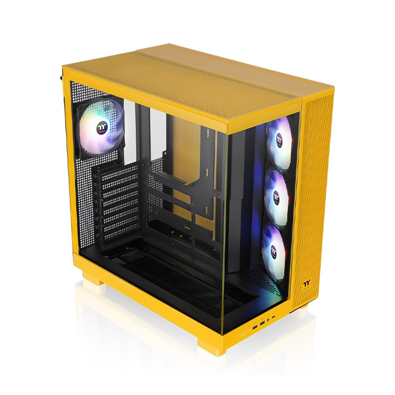 Boîtier Gaming Moyen Tour Thermaltake View 380 XL TG / ATX / RGB / Avec Panneaux Vitrés / Jaune - Processeur AMD Ryzen 7 9800X3D, (jusqu'à 5.2 GHz, 104 Mo de mémoire cache) - Mémoire 64 Go (4x 16 Go) DDR5-6000 MHz / RGB - Disque SSD M.2 NVMe 2 To - Carte graphique MSI GeForce RTX 5090 VENTUS 3X OC, 32 Go de mémoire GDDR7 dédiée - Carte Mère Gigabyte X870 AORUS ELITE WIFI7 / AM5 / ATX / DDR5 - Kit de Watercooling MSI MAG CORELIQUID E360 / ARGB / LGA 1700 / AM5 / Noir - Boîte d'alimentation MSI MAG A1250GL PCIE5 / 80 PLUS Gold / 1250 W / Noir - Garantie 1 an