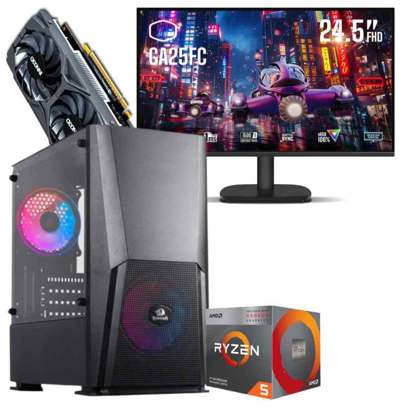Écran Gaming Cooler Master GA25FC 24.5" Full HD IPS / 120 Hz / Noir - Boîtier Gamer REDRAGON RINOS GC-590 M-ATX / 2 FAN ARGB / Noir - Processeur AMD Ryzen 5 3500X, (jusqu'à 4.1 Ghz, 35 Mo de mémoire cache) - RAM 16 Go (2x 8 Go) DDR4 - Disque SSD 2.5" SATA 512 Go - Carte graphique INNO3D GEFORCE GTX 1650 TWIN X2 OC V2, 4 Go de mémoire GDDR6 dédiée - Carte mère MSI A520M-A PRO / mATX / DDR4 - Ventilateur pour processeur Aerocool Air Frost Plus FRGB 3P - Boîte d'alimentation MSI MAG A500N-H / 500 Watts / ATX / Noir - Avec Ensemble Clavier et Souris Gaming - Garantie 1 an