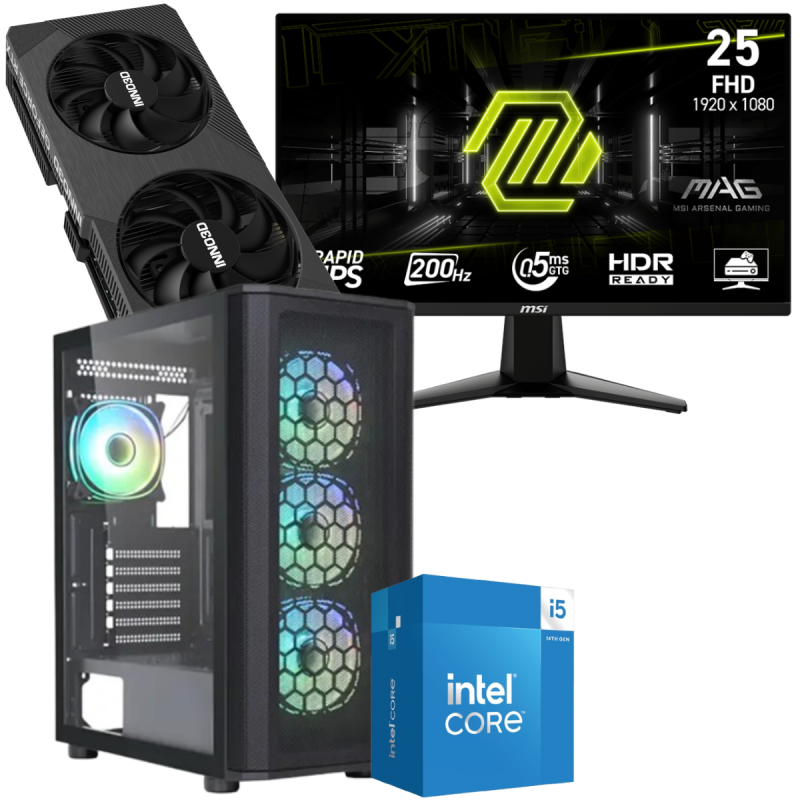 Écran Gaming MSI MAG 255F E20 24.5" Full HD IPS / 200 Hz / 0.5 ms / Noir - Boîtier Gamer Moyen Tour HYBROK CARBON ATX / ARGB / Noir - Processeur Intel Core i5-14400F 14e génération , (jusqu'à 4.7 Ghz, 20 Mo de mémoire cache) - RAM 16 Go (2x 8 Go) DDR4 - Disque SSD 2.5" SATA 512 Go - Carte graphique INNO3D GeForce RTX 5060 TWIN X2, 8 Go de mémoire GDDR7 dédiée - Carte mére MSI PRO H610M-E DDR4 - Boîte d'alimentation HYBROK PSU650WB 80 PLUS BRONZE - Avec Ensemble Clavier et Souris Gaming - Garantie 1 an