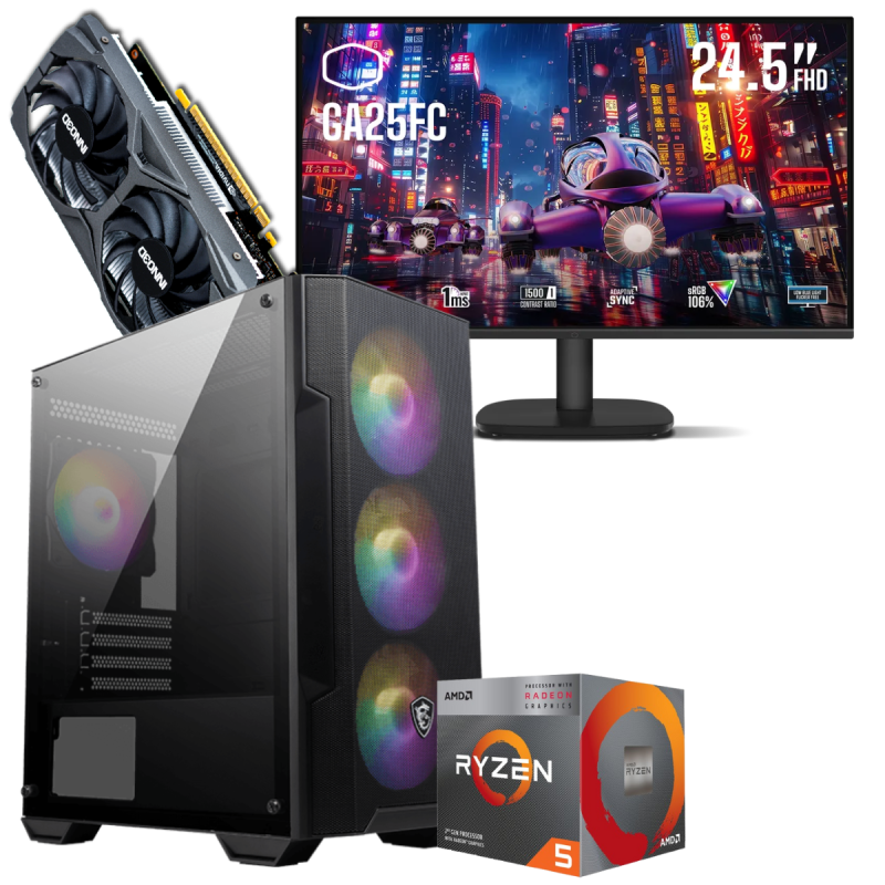 Écran Gaming Cooler Master GA25FC 24.5" Full HD IPS / 120 Hz / Noir - Boîtier Gamer MSI MAG FORGE M100A / Noir - Processeur AMD Ryzen 5 3400G, (jusqu'à 4.2 Ghz, 6 Mo de mémoire cache) - RAM 16 Go (2x 8 Go) DDR4 - Disque SSD M.2 NVMe 512 Go - Carte graphique INNO3D GEFORCE GTX 1650 TWIN X2 OC V2, 4 Go de mémoire GDDR6 dédiée - Carte mère MSI A520M-A PRO / mATX / DDR4 - Boîte d'alimentation MSI MAG A500N-H / 500 Watts / ATX / Noir - Avec Ensemble Clavier et Souris Gaming - Garantie 1 an