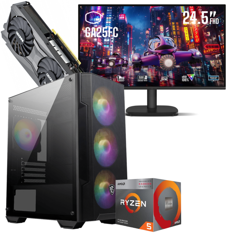 Écran Gaming Cooler Master GA25FC 24.5" Full HD IPS / 120 Hz / Noir - Boîtier Gamer MSI MAG FORGE M100A / Noir - Processeur AMD Ryzen 5 3600, (jusqu'à 4.2 Ghz, 35 Mo de mémoire cache) - RAM 16 Go (1x 16 Go) DDR4 - Disque SSD M.2 NVMe 512 Go - Carte graphique INNO3D GeForce RTX 3060 Twin X2, 12 Go de mémoire GDDR6 dédiée - Carte mère MSI A520M-A PRO / mATX / DDR4 - Boîte d'alimentation MSI MAG A500N-H / 500 Watts / ATX / Noir - Avec Ensemble Gaming Clavier + Souris + Tapis + Casque Havit KB501CM - Garantie 1 an
