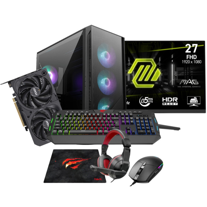 Écran Gaming MSI MAG272F 27" Full HD IPS / 200 Hz / 0.5 ms - Boîtier Gaming Moyen Tour MSI MAG FORGE 320R AIRFLOW / ATX / ARGB - Processeur AMD Ryzen 7 5800X, (jusqu'à 4.7 GHz, 36 Mo de mémoire cache) - RAM 32 Go (2x 16 Go) DDR4 - Disque SSD M.2 NVMe 1 To - Carte graphique MSI GeForce RTX 5050 Ventus 2C OC, 8 Go de mémoire GDDR6 dédiée - Carte mère MSI PRO B550M PRO-VDH - Refroidisseur De Processeur MSI MAG CoreLiquid A13 / 240 mm - Boîte d'alimentation MSI MAG A650BNL ATX / 650 WATTS / 80 PLUS Bronze - Avec Ensemble Gaming Clavier + Souris + Tapis + Casque Havit KB501CM - Windows 11 Pro - Garantie 1 an
