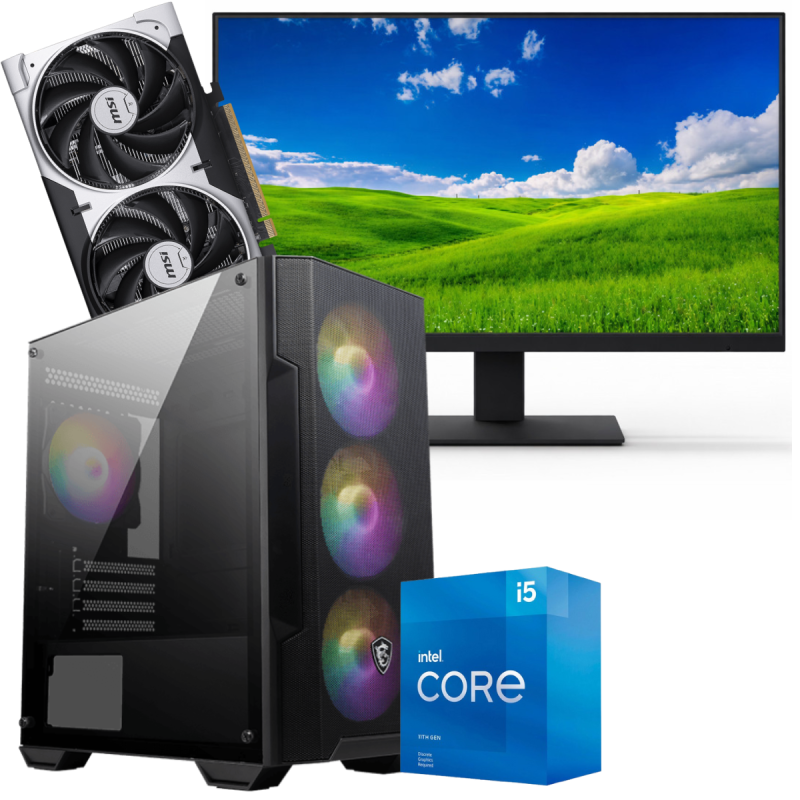 Écran Gaming AERO AE24EFI 24'' Full HD IPS / 144 Hz / 1ms / HDMI / DisplayPort / Haut-parleurs / Noir - Boîtier Gaming MSI MAG FORGE M100A / Noir - Processeur Intel Core i5-11400F 11e génération, (jusqu'à 4.4 Ghz, 12 Mo de mémoire cache) - RAM 16 Go (1x 16 Go) DDR4 - Disque SSD M.2 NVMe 512 Go - Carte graphique MSI NVIDIA GeForce RTX 5050 VENTUS 2X OC, 8 Go de mémoire GDDR6 dédiée - Carte mère Asus Prime H510M-K / Micro-ATX / DDR4 - Refroidisseur d'air pour processeur DeepCool AG200 / LGA 1700 / AM5 / Noir - Boîte d'alimentation HYBROK PSU550WB / 550 Watts / 80 PLUS BRONZE - Avec Ensemble Clavier + Souris Gaming - Garantie 1 an
