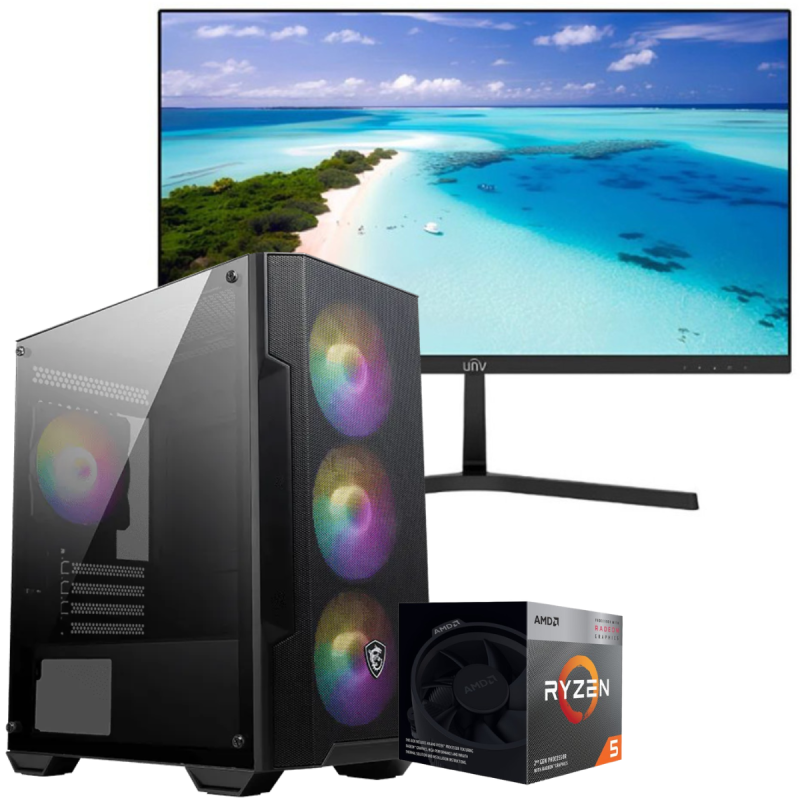 Écran De Bureau Uniview MW-LC22-E 22" Full HD LED / 100 Hz / Noir - Boîtier Gaming MSI MAG FORGE M100A / Noir - Processeur AMD Ryzen 5 3400G, (jusqu'à 4.2 Ghz, 6 Mo de mémoire cache) - RAM 16 Go (1x 16 Go) DDR4 - Disque SSD M.2 512 Go - Carte graphique AMD Radeon Vega 8 Graphics - Carte mère MSI A520M-A PRO / mATX / DDR4 - Boîte d'alimentation MSI MAG A300N-H / 300 Watts / ATX / Noir - Avec Ensemble Clavier + Souris Gaming - Garantie 1 an
