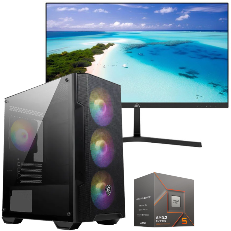 Écran De Bureau Uniview MW-LC22-E 22" Full HD LED / 100 Hz / Noir - Boîtier Gaming MSI MAG FORGE M100A / Noir - Processeur AMD Ryzen 5 Pro 5650G, (jusqu'à 4.4 Ghz, 19 Mo de mémoire cache) - RAM 16 Go (2x 8 Go) DDR4 - Disque SSD 2.5" SATA 512 Go - Carte graphique AMD Radeon Vega 7 Graphics - Carte mère MSI A520M-A PRO / mATX / DDR4 - Boîte d'alimentation MSI MAG A500N-H / 500 Watts / ATX / Noir - Avec Ensemble Clavier + Souris Gaming - Garantie 1 an