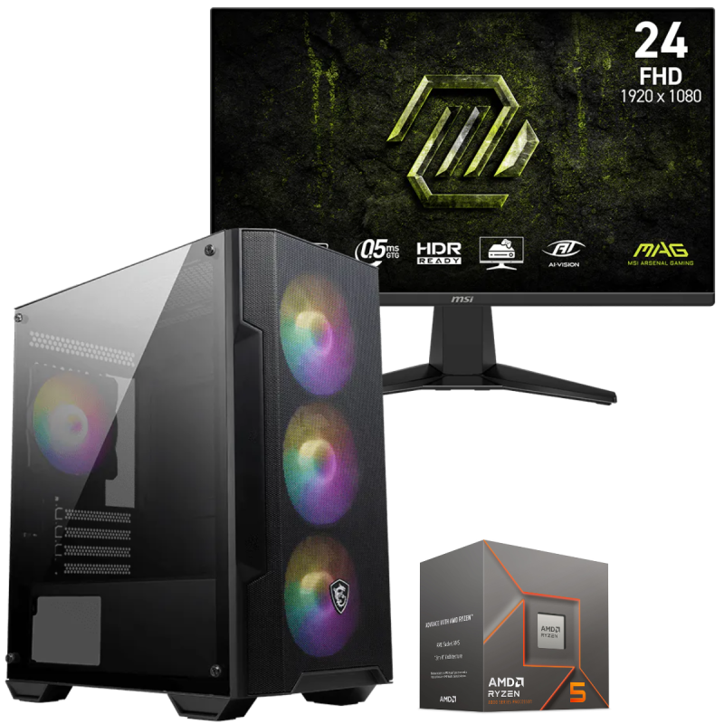Écran Gaming MSI MAG 245F X24 24" Full HD IPS / 240 Hz / HDMI/DP / Noir - Boîtier Gaming MSI MAG FORGE M100A / Noir - Processeur AMD Ryzen 5 Pro 5650G, (jusqu'à 4.4 Ghz, 19 Mo de mémoire cache) - RAM 16 Go (2x 8 Go) DDR4 - Disque SSD 2.5" SATA 512 Go - Carte graphique AMD Radeon Vega 7 Graphics - Carte mère MSI A520M-A PRO / mATX / DDR4 - Boîte d'alimentation MSI MAG A500N-H / 500 Watts / ATX / Noir - Avec Ensemble Clavier + Souris Gaming - Garantie 1 an