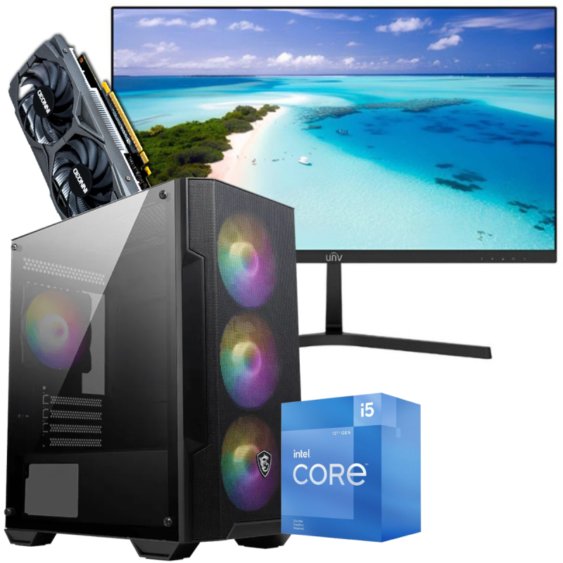 Écran De Bureau Uniview MW-LC24-E 24" Full HD LED / 100 Hz / Noir - Boîtier Gaming MSI MAG FORGE M100A / Noir - Processeur Intel Core i5-12400F 12e génération, (jusqu'à 4.4 Ghz, 18 Mo de mémoire cache) - RAM 16 Go (1x 16 Go) DDR4 - Disque SSD M.2 256 Go - Carte graphique INNO3D GEFORCE GTX 1650 TWIN X2 OC V3, 4 Go de mémoire GDDR6 dédiée - Carte mére MSI PRO H610M-E / Micro ATX / LGA1700 / DDR4 - Boîte d'alimentation MSI MAG A500N-H / 500 Watts / ATX / Noir - Avec Ensemble Clavier + Souris Gaming - Garantie 1 an
