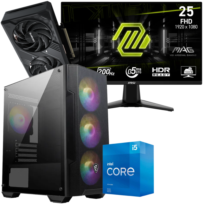 Écran Gaming MSI MAG 255F E20 24.5" Full HD IPS / 200 Hz / 0.5 ms / Noir - Boîtier Gaming MSI MAG FORGE M100A / Noir - Processeur Intel Core i5-11400F 11e génération, (jusqu'à 4.4 Ghz, 12 Mo de mémoire cache) - RAM 16 Go (1x 16 Go) DDR4 - Disque SSD M.2 512 Go - Carte graphique Gigabyte GeForce RTX 5050 WINDFORCE OC, 8 Go de mémoire GDDR6 dédiée - Carte mère ASUS PRIME H510M-R R2.0 / mATX / DDR4 - Refroidisseur d'air pour processeur DeepCool AG200 / LGA 1700 / AM5 / Noir - Boîte d'alimentation MSI MAG A500N-H / 500 Watts / ATX / Noir - Avec Ensemble Clavier + Souris Gaming - Garantie 1 an