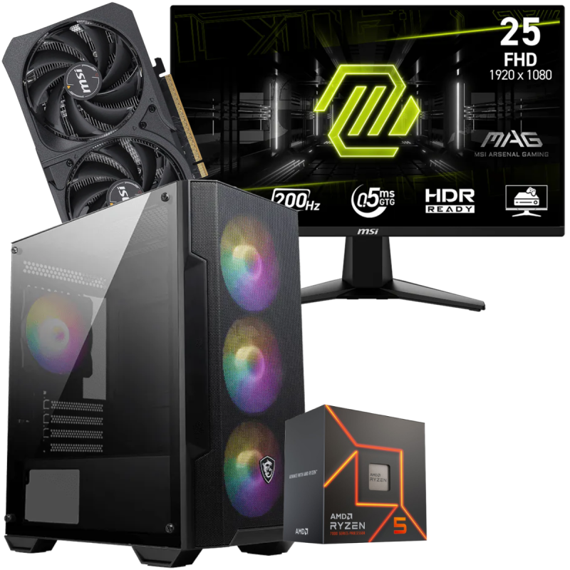 Écran Gaming MSI MAG 255F E20 24.5" Full HD IPS / 200 Hz / 0.5 ms / Noir - Boîtier Gaming MSI MAG FORGE M100A / Noir - Processeur AMD Ryzen 5 7600, (jusqu'à 5.1 Ghz, 38 Mo de mémoire cache) - RAM 16 Go (1x 16 Go) DDR5 - Disque SSD 2.5" SATA 1 To - Carte graphique MSI GeForce RTX 5050 8G SHADOW 2X OC Bulk, 8 Go de mémoire GDDR6 dédiée - Carte mère MSI PRO A620AM-B EVO / mATX / DDR5 - Boîte d'alimentation MSI MAG A600DN / 600 Watts / ATX / 80 PLUS Standard / Noir - Avec Ensemble Clavier + Souris Gaming - Garantie 1 an