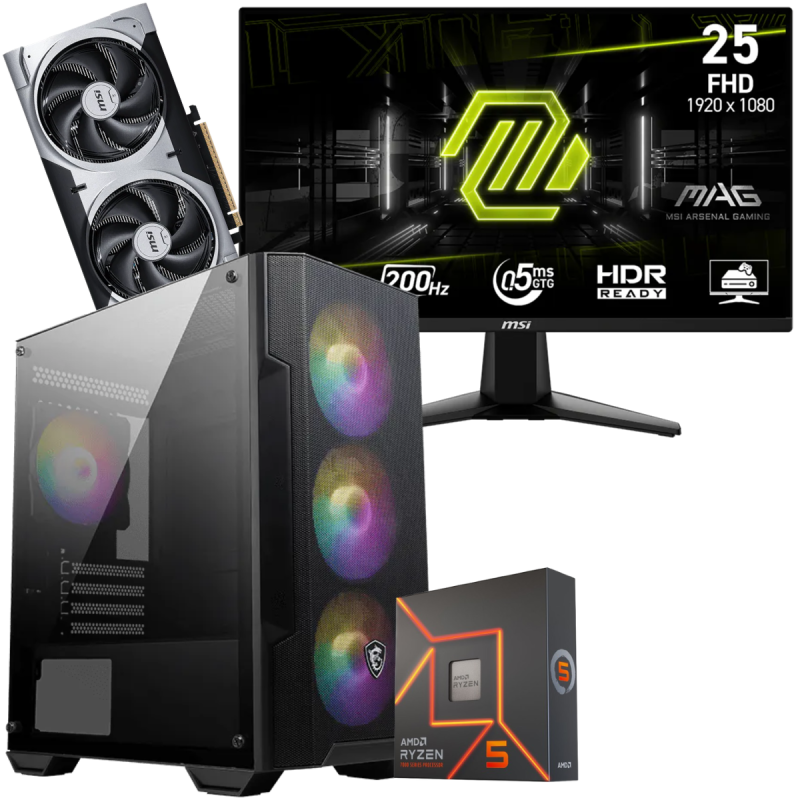 Écran Gaming MSI MAG 255F E20 24.5" Full HD IPS / 200 Hz / 0.5 ms / Noir - Boîtier Gaming Moyen Tour MSI MAG FORGE M100R / Micro ATX / Noir - Processeur AMD Ryzen 5 7600X, (jusqu'à 5.3 Ghz, 38 Mo de mémoire cache) - RAM 16 Go (1x 16 Go) DDR5 - Disque SSD 2.5" SATA 1 To - Carte graphique MSI GeForce RTX 5060 Ti VENTUS 2X OC PLUS, 8 Go de mémoire GDDR7 dédiée - Carte mère MSI PRO A620AM-B EVO / mATX / DDR5 - Watercooling HYBROK HL240B COOLING 240 mm / LGA 1700 / ARGB / Noir - Boîte d'alimentation MSI MAG A650BN / 650 Watts / ATX / 80 PLUS Bronze / Noir - Avec Ensemble Clavier + Souris Gaming - Garantie 1 an