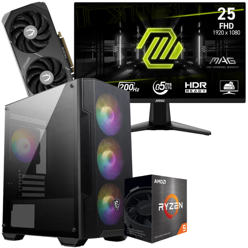 Écran Gaming MSI MAG 255F E20 24.5" Full HD IPS / 200 Hz / 0.5 ms / Noir - Boîtier Gaming MSI MAG FORGE M100A / Noir - Processeur AMD Ryzen 5 5500, (jusqu'à 4.2 Ghz, 19 Mo de mémoire cache) - RAM 16 Go (2x 8 Go) DDR4 - Disque SSD 2.5" SATA 1 To - Carte graphique ZOTAC GAMING GeForce RTX 5060 Ti Twin Edge, 8 Go de mémoire GDDR7 dédiée - Carte mère MSI A520M-A PRO / mATX / DDR4 - Boîte d'alimentation MSI MAG A600DN / 600 Watts / ATX / 80 PLUS Standard / Noir - Avec Ensemble Clavier + Souris Gaming - Garantie 1 an