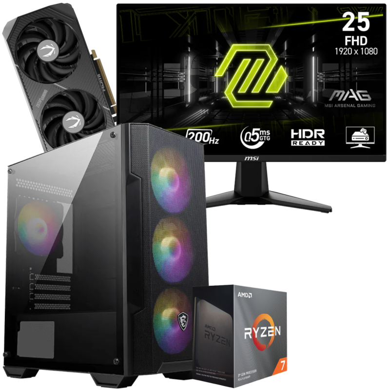 Écran Gaming MSI MAG 255F E20 24.5" Full HD IPS / 200 Hz / 0.5 ms / Noir - Boîtier Gaming MSI MAG FORGE M100A / Noir - Processeur AMD Ryzen 7 5700, (jusqu'à 4.6 Ghz, 20 Mo de mémoire cache) - RAM 32 Go (2x 16 Go) DDR4 - Disque SSD 2.5" SATA 1 To - Carte graphique ZOTAC GAMING GeForce RTX 5060 Ti Twin Edge, 8 Go de mémoire GDDR7 dédiée - Carte mère MSI B550M-A-PRO - Ventilateur de processeur DeepCool AK400 ZERO DARK / Noir - Boîte d'alimentation MSI MAG A600DN / 600 Watts / ATX / 80 PLUS Standard / Noir - Avec Ensemble Clavier + Souris Gaming - Garantie 1 an