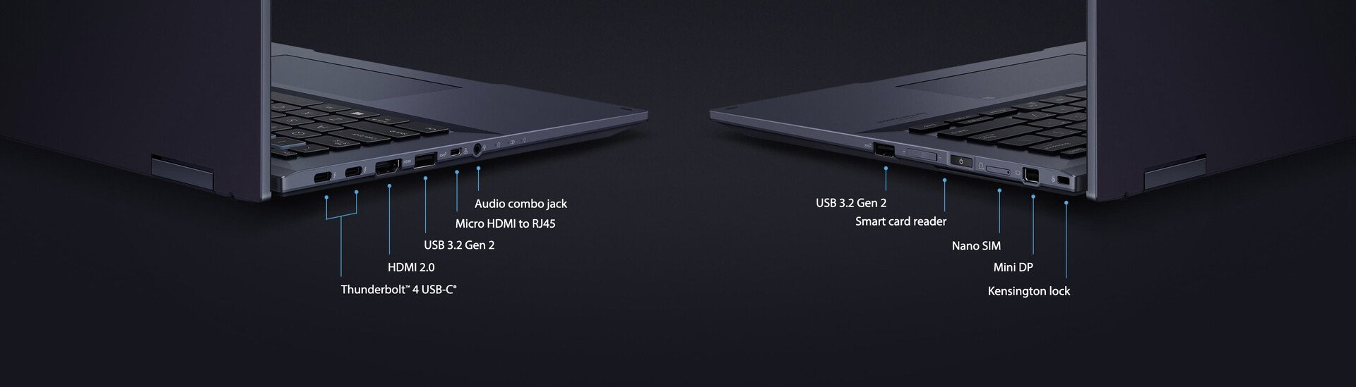 Pour les utilisateurs professionnels, davantage de connectivité d'E/S est toujours préférable, c’est pourquoi l’ExpertBook B7 Flip vous offre les options les plus complètes possibles. La connectivité mobile 5G est permise par le nouvel emplacement nano-SIM. Par ailleurs, le lecteur de carte à puce intégré peut être utilisé comme un contrôle d'identité secondaire pour le dispositif amélioré. Le PC portable comprend également deux ports Thunderbolt™ 4 USB-C®, qui prennent en charge les vitesses de transfert de données de 40 Go/s, l'affichage 4K et la charge rapide. L’ExpertBook B7 Flip supporte également jusqu’à trois écrans 4K externes.