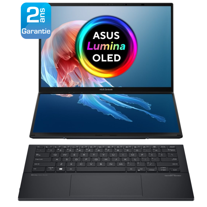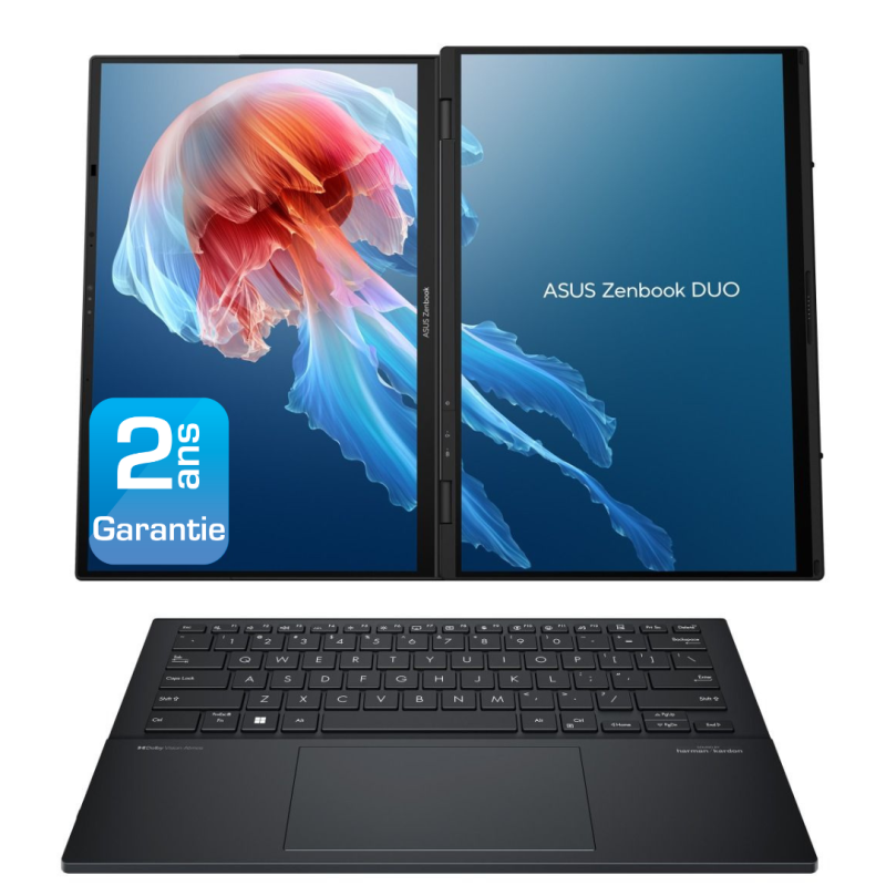 Le Zenbook DUO d'ASUS est un ordinateur portable révolutionnaire à double écran, équipé de deux grands écrans tactiles OLED, d'un clavier détachable grand format et d'un support intégré, combinant de manière experte la polyvalence du multitâche et une mobilité exceptionnelle. Les deux écrans 3K OLED 120 Hz de 14 pouces vous permettent d'étendre instantanément votre espace de travail jusqu'à 19,8 pouces. Les performances exceptionnelles sont assurées par un processeur Intel Core Ultra 9 alimenté par l'IA et 32 Go de mémoire LPDDR5x, ainsi qu'un disque SSD PCIe 4.0 1 To. Associé à un logiciel intelligent dédié, à un contrôle gestuel intuitif et à une batterie de 75 Wh à la durée de vie améliorée, le Zenbook DUO, facile à utiliser, maximise la productivité, sans aucune difficulté. Un PC. Deux écrans. Des possibilités infinies.