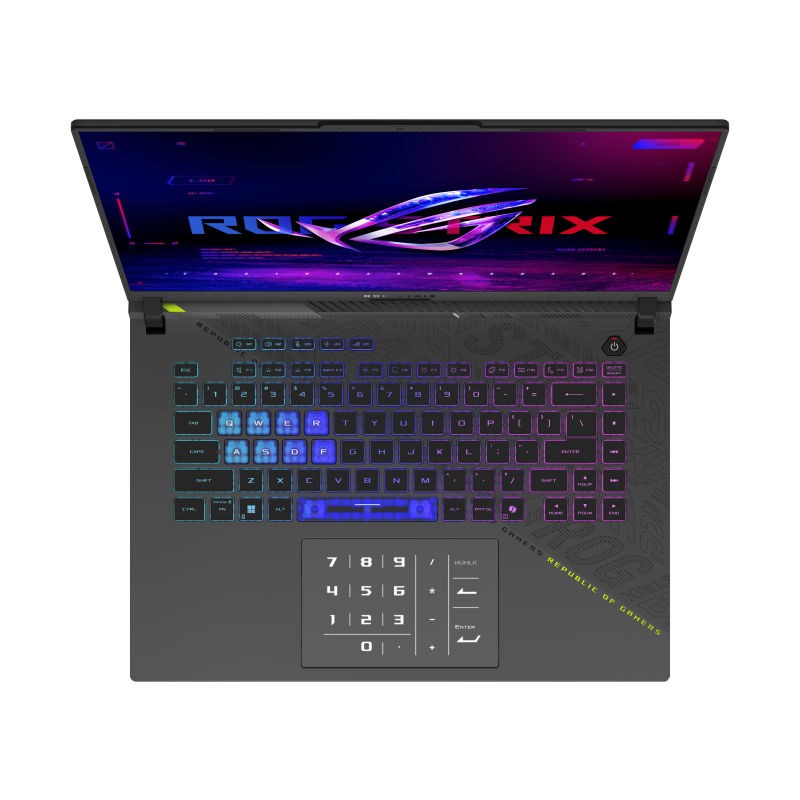 Écran ROG Nebula 16" 2.5K (2560 x 1600, WQXGA), Niveau IPS, antireflet, 240 Hz, G-Sync, HDR - Processeur Intel Core Ultra 9 275HX, (jusqu’à 5.4 GHz, 36 Mo de mémoire cache) - Mémoire 16 Go DDR5 - Disque SSD NVMe M.2 1 To - Carte graphique NVIDIA GeForce RTX 5070, 8 Go de mémoire GDDR7 dédiée - Clavier chiclet rétroéclairé RGB touche par touche, pavé tactile, Prise en charge du pavé numérique Avec la clé Copilot - Caméra FHD 1080p - Audio Dolby Atmos - Microphone intégré - Système à 2 haut-parleurs avec technologie d'amplification intelligente - Wi-Fi 6E - Bluetooth 5.3 - SYNCHRONISATION AURA, Barre lumineuse Aura Sync - 1x prise audio combinée 3.5 mm - 1x HDMI 2.1 FRL - 2x ports USB 3.2 Gen 2 Type-A - 2x portx USB 4 Type-C - 1x port LAN RJ45 - Windows 11 - Couleur Noir - Garantie 2 ans Avec Sac à dos ASUS ROG