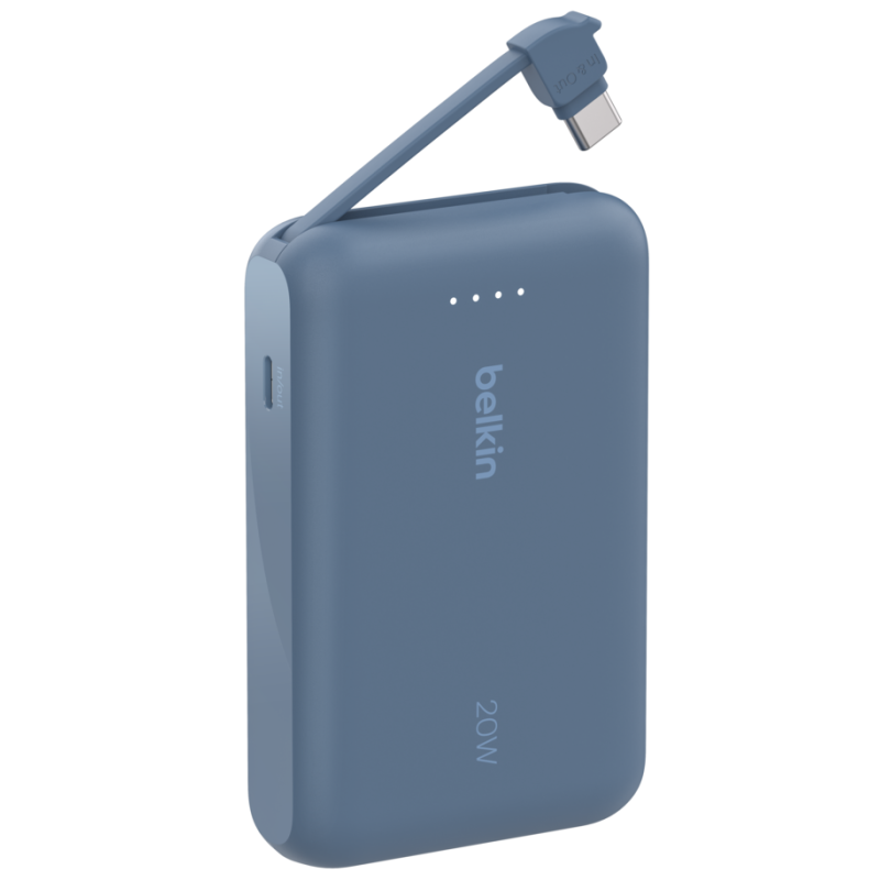Chargeur portable Belkin BoostCharge - Design fin, compact et léger - Puissance de sortie : 20 W - Capacité de batterie : 10 000 mAh - offre jusqu'à 43 heures de lecture continue - Rechargez deux appareils en même temps - Voyant LED pour indiquer l'état de la batterie externe - Fonction Pass-Through pour recharger un appareil tout en rechargeant la batterie externe - port USB-C - Câble USB-C intégré de 5,7 cm - Dimensions (L x l x H) : 9,9 cm x 6,4 cm x 2,3 cm - Couleur Bleu - Garantie 1 an