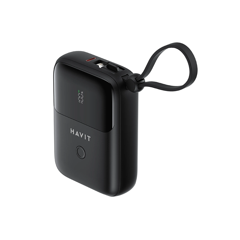 Power Bank HAVIT PB5215 - Puissance : 20W - Capacité 10000mAh - Entrée : USB-C - Sortie : Câble Lightning, Câble USB-C - Matériau : ABS - Couleur Noir