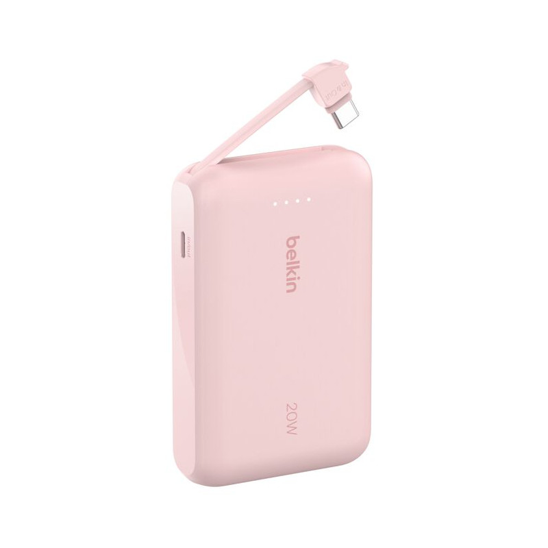 Chargeur portable Belkin BoostCharge - Design fin, compact et léger - Puissance de sortie : 20 W - Capacité de batterie : 10 000 mAh - offre jusqu'à 43 heures de lecture continue - Rechargez deux appareils en même temps - Voyant LED pour indiquer l'état de la batterie externe - Fonction Pass-Through pour recharger un appareil tout en rechargeant la batterie externe - port USB-C - Câble USB-C intégré de 5,7 cm - Dimensions (L x l x H) : 9,9 cm x 6,4 cm x 2,3 cm - Couleur Rose - Garantie 1 an