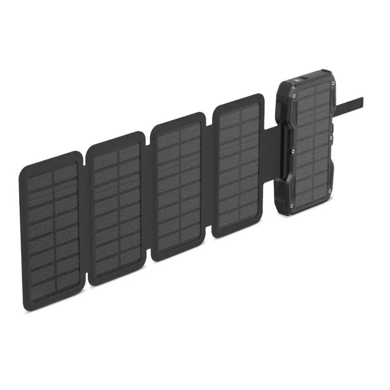 Écran LCD - lampe torche LED à 3 modes - Capacité : 10 000 mAh - Batterie : Polymère de lithium - Puissance maximale : 22.5 W - Temps de charge : 3 heures - Connecteurs d'entrée : 1 x USB-C + panneaux solaires / Connecteurs de sortie : 1 port USB-C + 1 port USB-A - Type de charge : simultané (réseau + périphériques externes) Rapide - Rechargez jusqu'à 3 appareils simultanément avec cette batterie externe solaire (USB-A, USB-Cz, charge sans fil) - Couleur Noir - Garantie 1 an