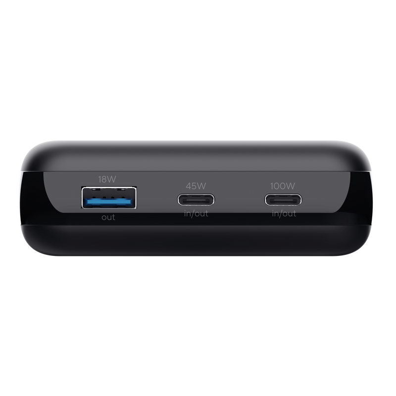 Puissance d'entrée : 100 W / 45 W - Puissance de sortie maximale totale : 100 W - Technologie de recharge : Charge rapide 3.0, détection automatique, USB PD 3.0 + PPS - Nombre de ports USB : 3 (2x USB-C, 1x USB-A) - longueur du câble principal 15 cm - Types d'appareils compatibles : Ordinateur Portable, Smartphone, Tablette - Poids : 407 g - Couleur Noir - Garantie 1 an