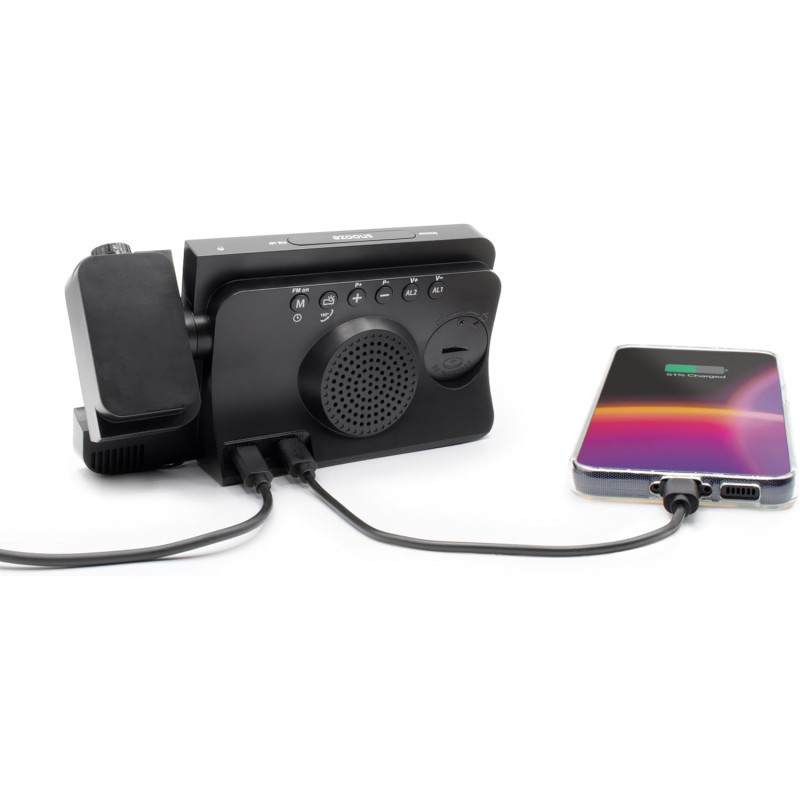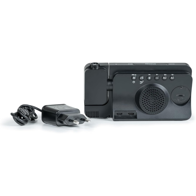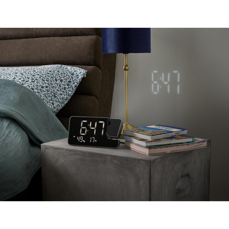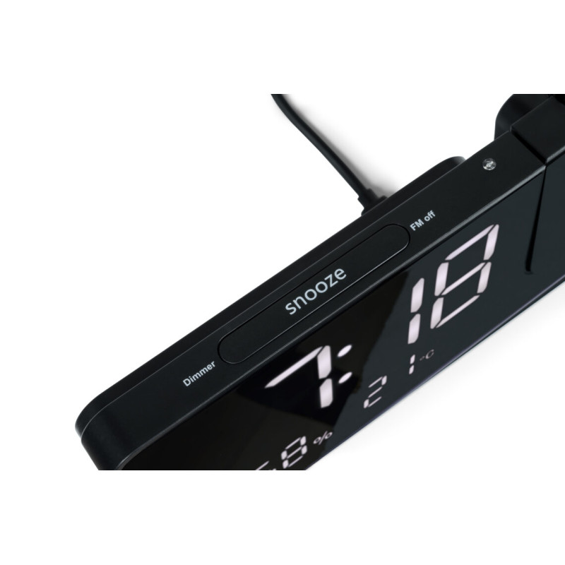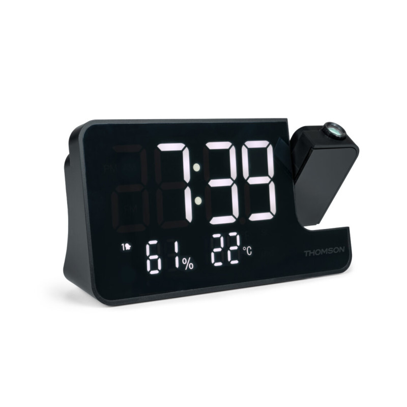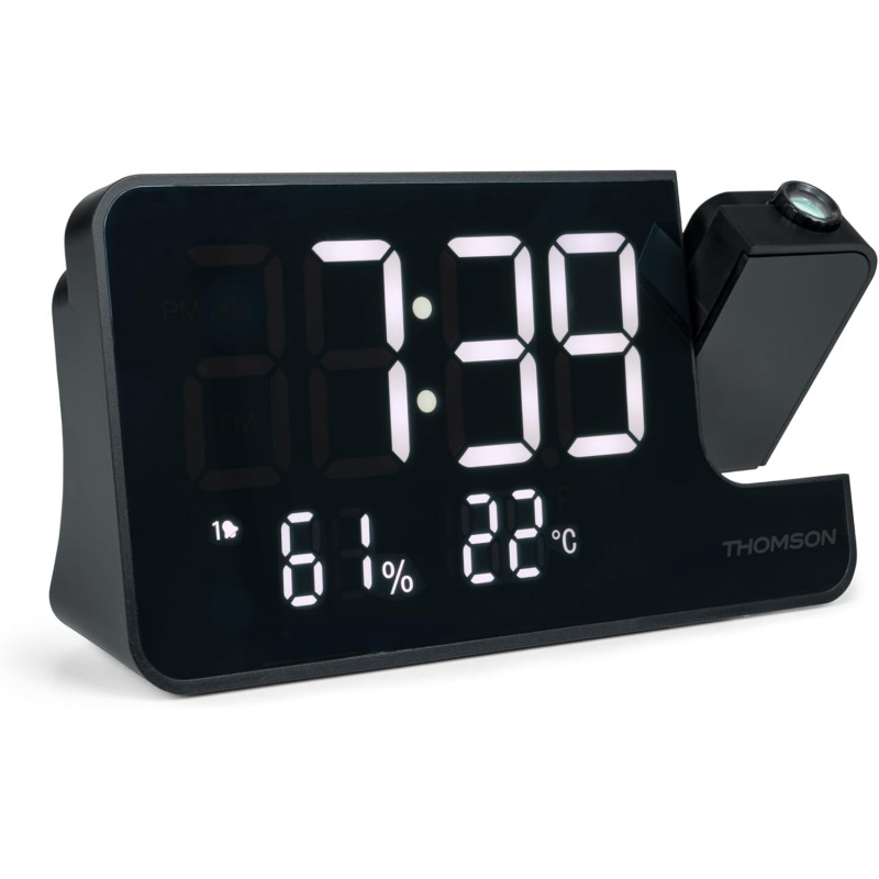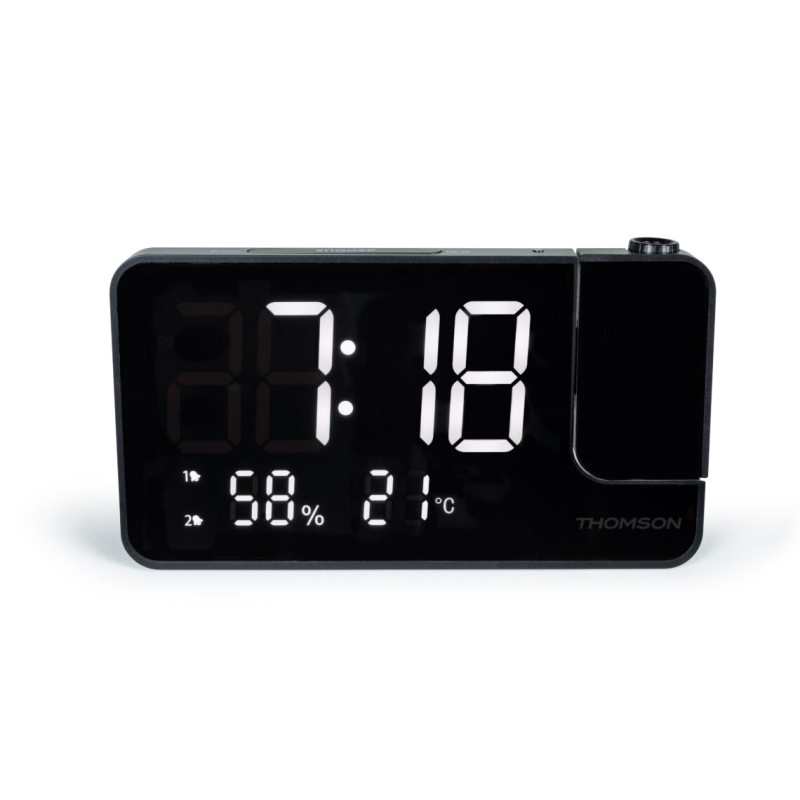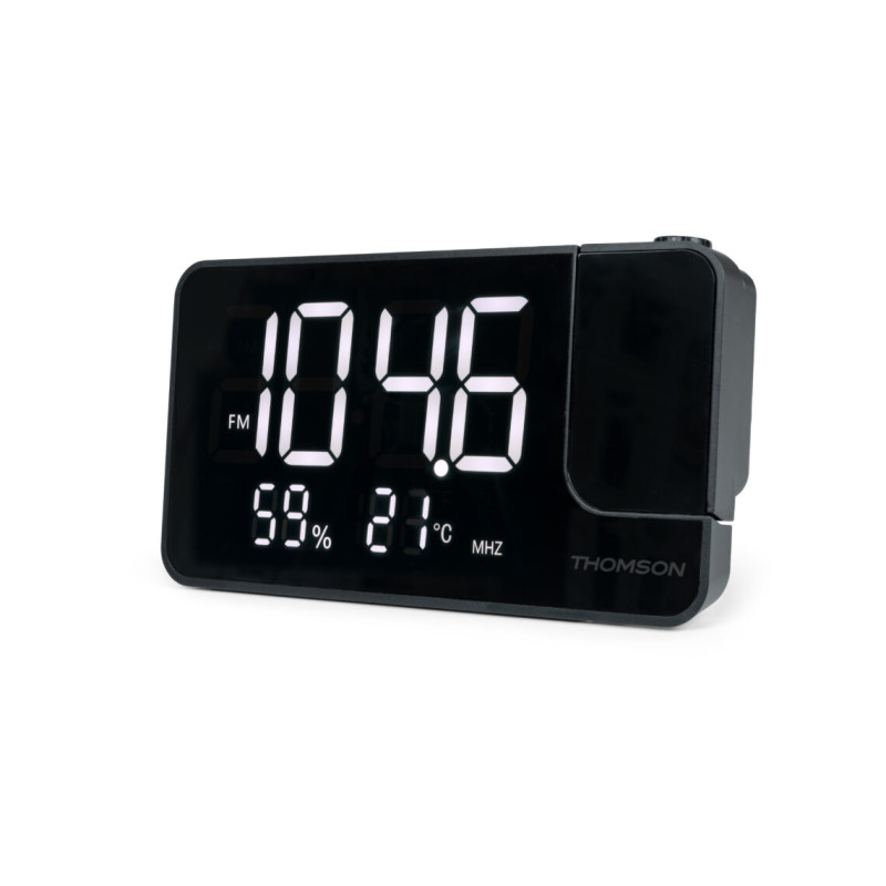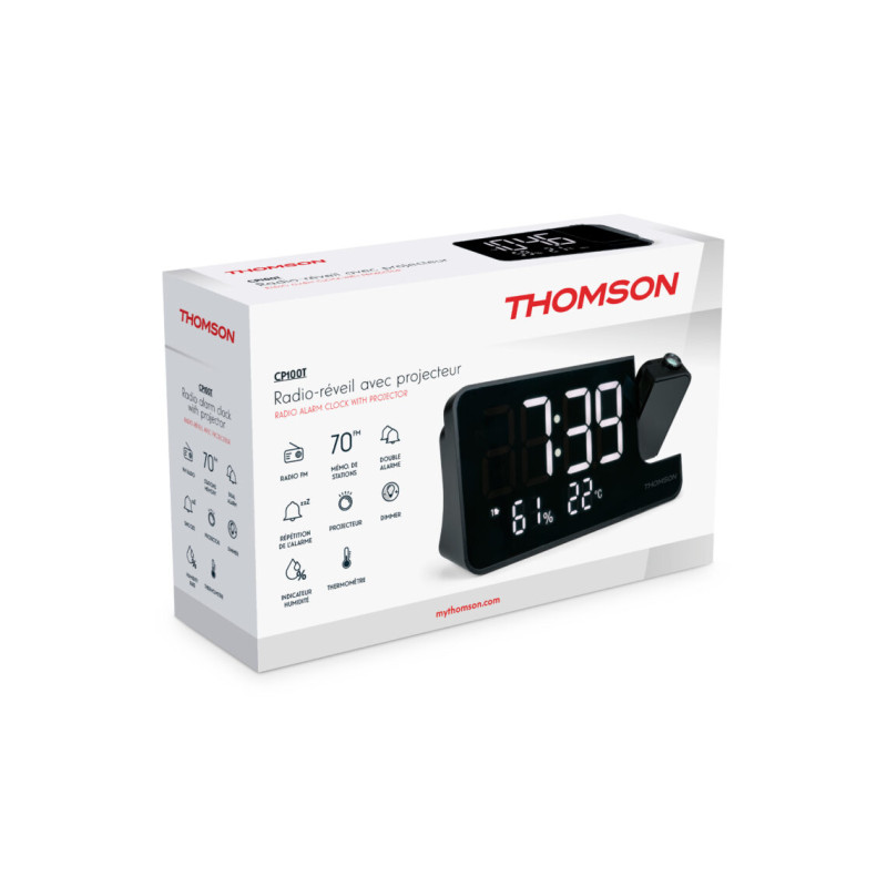 Radio-Réveil avec projection CP100T THOMSON - Radio FM avec autoscan - Double alarme avec fonction snooze - 20 stations mémorisables - Projection de l’heure ajustable - Affichage de l’heure, de la température intérieure et du taux d’humidité de la pièce - 12h/24 heures - Minuterie 5 à 90 min - 3 Réglages de l’intensité lumineuse de l’écran 0 à 100% - Chargeur USB-C (5V – 1A) - Sauvegarde de l’heure (Pile CR2032) - Adaptateur secteur inclus – 5V 1.5A 7.5W - Poids : 0.24 kg - Couleur Noir - Garantie 1 an