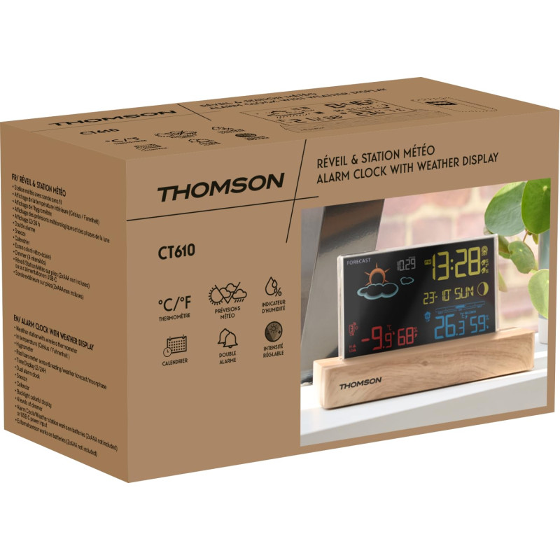 Réveil et station météo THOMSON CT610 - Ecran coloré rétro-éclairé - Réveil double alarme avec Snooze - Station météo avec sonde sans fil - Affichage de la température intérieure (Celsius / Farenheit) - Affichage de l’hygrométrie - Affichage des prévisions météorologiques et des phases de la lune - Dimmer (4 intensités) - Calendrier - Affichage 12/24h - Réveil/Station Météo sur piles (2xAAA non incluses) ou sur alimentation en USB-C - Sonde extérieure sur piles (2xAAA non incluses) - Garantie 1 an