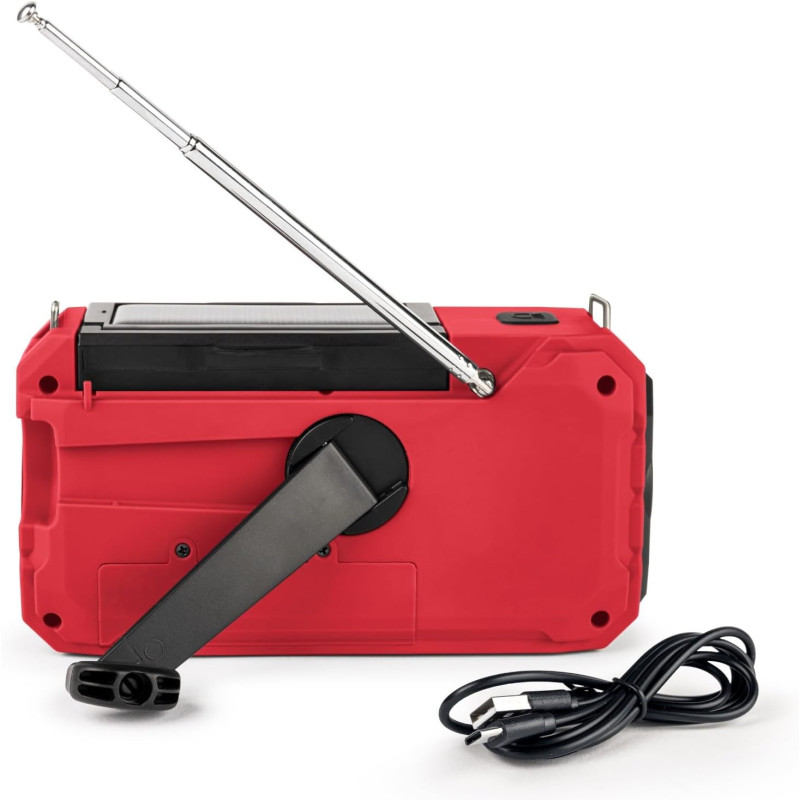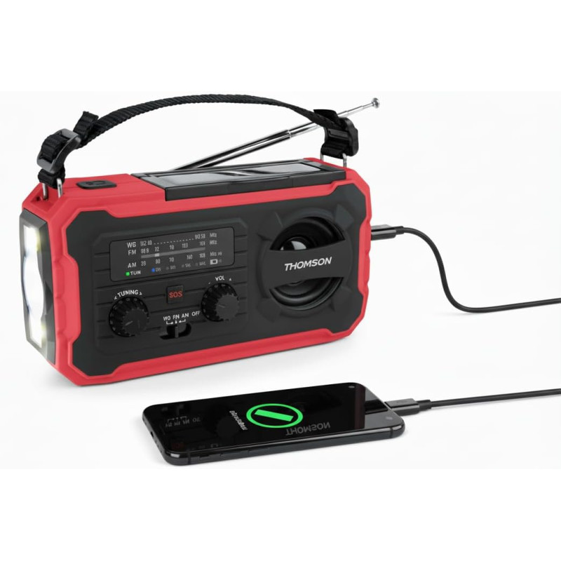 Radio solaire d’urgence longue durée RT280G THOMSON - Lampe torche intégrée et lampe de lecture - Mode SOS : lumière et alarme - Antenne téléscopique rétractable - Recharge solaire - Manivelle pour recharger le produit (Dynamo) - Batterie Li-ion rechargeable par USB-C de 8000mAh (câble inclus) - Indicateur de batterie 25-50-75-100% - Couleur Rouge - Garantie 1 an