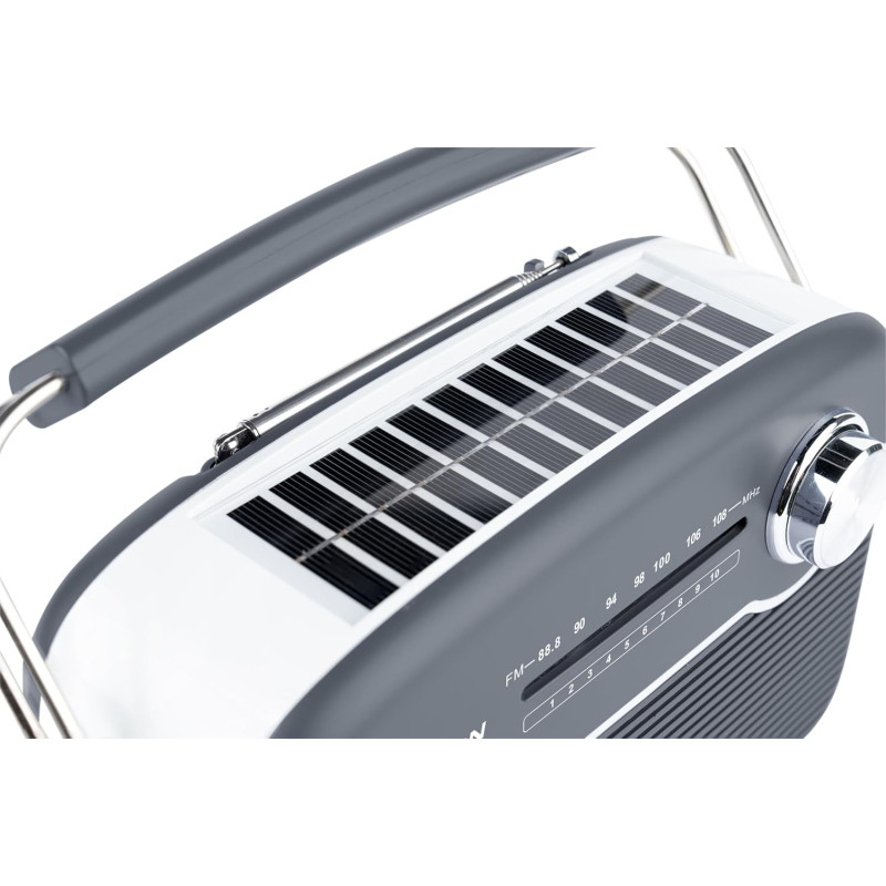 Radio Bluetooth à recharge solaire - Radio FM analogique - Connectivité : Bluetooth 5.4 - Antenne téléscopique chromée rétractable - Entrée auxiliaire 3.5mm - Batterie Li-ion rechargeable par USB-C de 1300mAh (câble inclus) ou par panneau solaire - Couleur Gris - Garantie 1 an