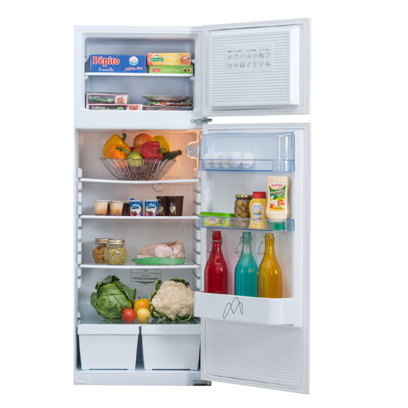 Système de Dégivrage : De Frost (Froid Ventilé) - Classe énergétique : 2 - Volume Net Totale : 210 Litres (Réfrigérateur : 164 Litres , Congélateur : 46 Litres) - Consommation d'énergie annuelle : 245 KWh - INVERTER : Non - Eclairage LED - Nombre d'étoiles congélateur : ★★★★ - Thermostat réglable - Poignées apparentes - Pouvoir de congélation : 2 kg/24H - Poids : 36Kg - Dimensions (LxHXP) : 55 x 152 x 56 cm - Type de Gaz : R600a - Couleur : Blanc - Garantie 2 ans
