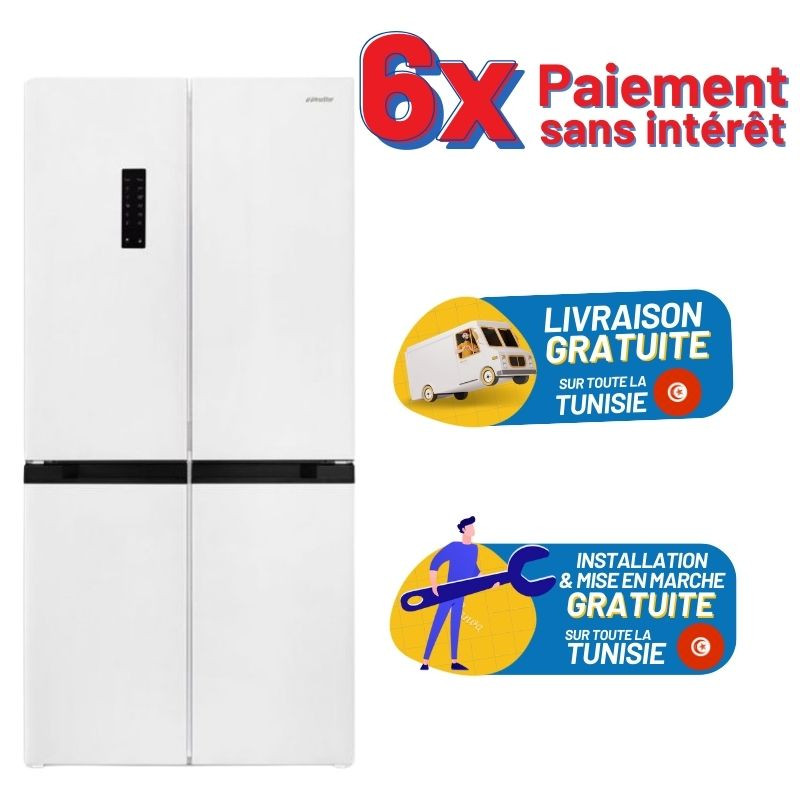 6 * Paiement sans intérêt - Réfrigérateur NEWSTAR Side By Side - 4 Portes - Système de refroidissement: NoFrost - Capacité Net Total: 488 Litres - Capacité Net réfrigérateur: 322 Litres - Volume net congélateur: 166 Litres - Classe énergétique: A++ - Autonomie: 12h - Alimentation: 220 -240 / 50Hz - Eclairage LED interieur - Ecran LED tactile - Pieds avant réglables - Réfrigérateur smart technologie inverter - Compresseur Inverter économique et plus silencieux - Multi Cooling - 2 Etagère en verre dans la partie réfrigérateur - 2 Bac à légumes - 6 Etagère porte - 2 tiroire dans la partie congélateur - 4 Bac dans la partie congélateur - Bac à Glaçons - Bac oeuf - Dimensions (HxLxP): 179 x 84 x 69 cm - Couleur Blanc - Garantie: 1 an