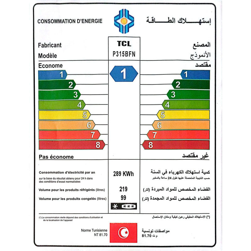 Système de Dégivrage : No Frost - Classe énergétique : 1 - Volume Net Totale : 318 Litres (Réfrigérateur : 219 Litres , Congélateur : 99 Litres) - Consommation d'énergie annuelle : 289 KWh - INVERTER : Non - Nombre d'étoiles congélateur : ★★★★ - Dimensions (LxHxP) : 595 x 1850 x 630 - Couleur : Silver - Garantie 3 ans