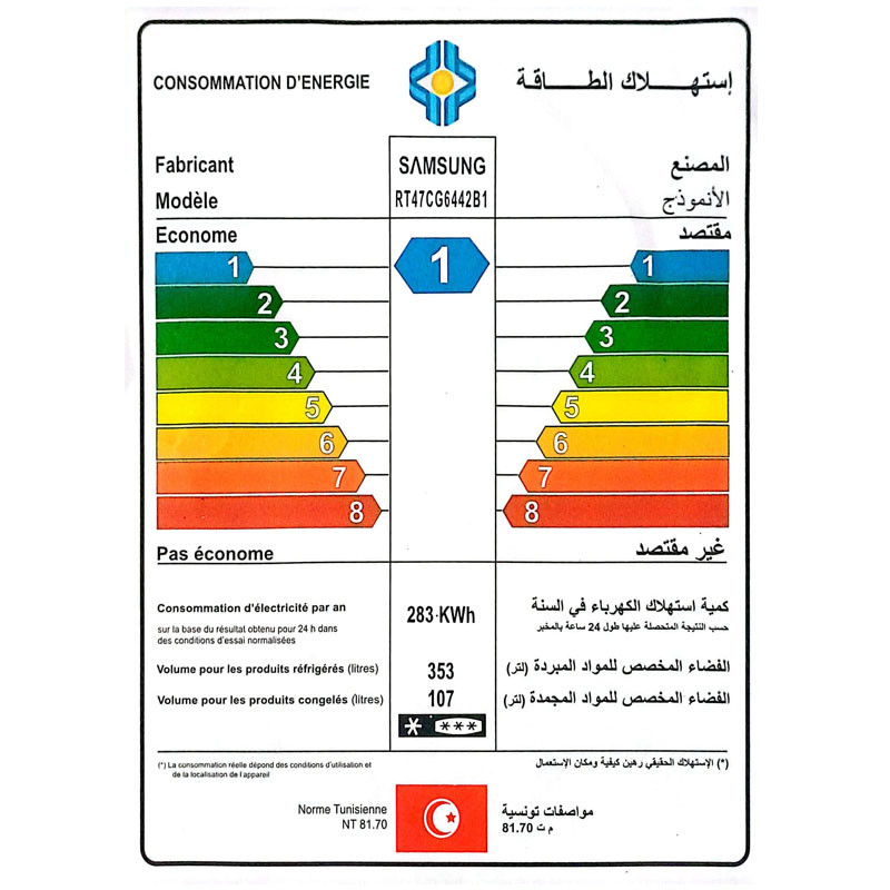 Système de Dégivrage : No Frost (Froid Ventilé) - Classe énergétique : 1 - Volume Net Totale : 460 Litres (Réfrigérateur : 353 Litres , Congélateur : 107 Litres) - Consommation d'énergie annuelle : 283 KWh - INVERTER : Oui - Nombre d'étoiles congélateur : ★★★★ - Type de refroidissement : All arround cooling - Bac à glaçons - Dimensions (LxHXP) : 700 x 1825 x 717 mm - Multi flow - Type de Gaz : R600a - Couleur : Silver - Garantie 3 ans + Garantie 20 ans Sur le Compresseur