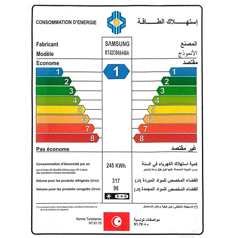 Système de Dégivrage : No Frost (Froid Ventilé) - Classe énergétique : 1 - Volume Net Totale : 415 Litres (Réfrigérateur : 317Litres , Congélateur : 98 Litres) - Consommation d'énergie annuelle : 245 KWh - INVERTER : Oui - Nombre d'étoiles congélateur : ★★★★ - Type de refroidissement : Mono Cooling - Bac à glaçons - Wi-Fi intégré - Multi Flow - Dimensions (LxHXP) : 912 x 1780 x 716 mm - Poids Net : 112 kg - Type de Gaz : R600a - Couleur : Silver - Garantie 3 ans + Garantie 20 ans Sur le Compresseur