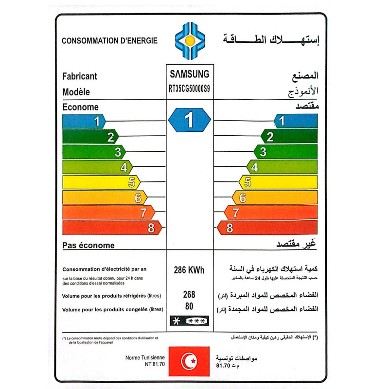 Système de Dégivrage : No Frost (Froid Ventilé) - Classe énergétique : 1 - Volume Net Totale : 348 Litres (Réfrigérateur : 268 Litres , Congélateur : 80 Litres) - Consommation d'énergie annuelle : 286 KWh - INVERTER : Oui - Nombre d'étoiles congélateur : ★★★★ - Type de refroidissement : Mono refroidissement - Dimensions (LxHXP) : 60 x 171.5 x 70.9 cm - Type de Gaz : R600a - Couleur : INOX - Garantie 3 ans + Garantie 20 ans Sur le Compresseur