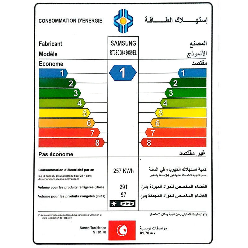 Système de Dégivrage : No Frost (Froid Ventilé) - Classe énergétique : 1 - Volume Net Totale : 388 Litres (Réfrigérateur : 291 Litres , Congélateur : 97 Litres) - Consommation d'énergie annuelle : 257 KWh - INVERTER : Oui - Nombre d'étoiles congélateur : ★★★★ - Type de refroidissement : Mono cooling - Bac à glaçons - Multi Flow - Dimensions (LxHXP) : 700 x 1715 x 672 mm - Poids Net : 58.1kg - Type de Gaz : R600a - Couleur : Silver - Garantie 3 ans + Garantie 20 ans Sur le Compresseur