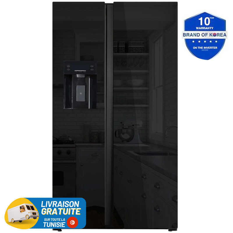 Réfrigérateur Hyundai No Frost INVERTER Side By Side 556 Litres / Verre Noir + Robot Multifonctions GRATUIT