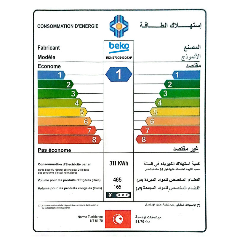 Système de Dégivrage : No Frost (Froid Ventilé) - Classe énergétique : 1 - Volume Brut Totale : 650 Litres - Volume Net Totale : 630 Litres (Réfrigérateur : 465 Litres , Congélateur : 165 Litres) - Consommation d'énergie annuelle : 311 KWh - INVERTER : Non - Eclairage LED - Nombre d'étoiles congélateur : ★★★★ - Capacité de la boîte à œufs : 6 - Congélation Rapide - 1x Bacs à légumes - Alarme de porte ouverte - Distributeur d'eau SlimTank - Capacité de congélation par jour : 10 kg - Niveau sonore : 37 dB - Poids : 99 kg - Dimensions (LxHXP) : 83.2 x 187.7 x 76.2 cm - Type de Gaz : R600a - Couleur : Silver - Garantie 3 ans