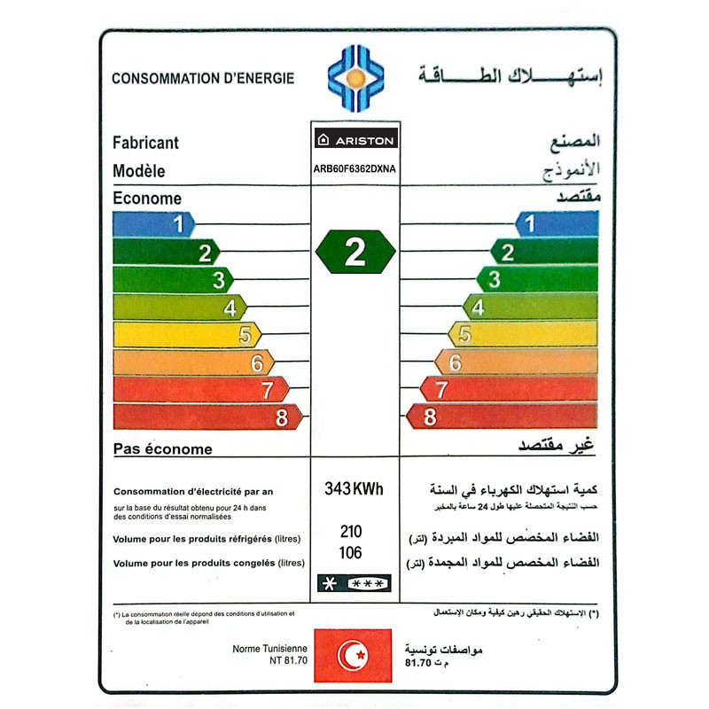Système de Dégivrage : No Frost - Classe énergétique : 2 - Volume Net Totale : 316 Litres (Réfrigérateur : 210 Litres , Congélateur : 106 Litres) - Consommation d'énergie annuelle : 343 KWh - INVERTER : Non - Nombre d'étoiles congélateur : ★★★★ - Poignées externes argentée - Type de contrôle : Tactile - Capacité de congélation : 6kg/24hr - Type de Gaz : R600a - Couleur : Silver - Garantie 3 ans