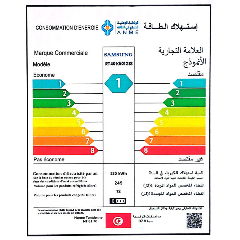 Système de Dégivrage : No Frost (Froid Ventilé) - Classe énergétique : 1 - Volume Net Totale : 322 Litres (Réfrigérateur : 249 Litres , Congélateur : 73 Litres) - Consommation d'énergie annuelle : 230 KWh - INVERTER : Oui - Nombre d'étoiles congélateur : ★★★★ - Type de refroidissement : All arround cooling - Bac à glaçons - Multi Flow - Dimensions (LxHXP) : 60 x 171.5 x 67.2 cm - Type de Gaz : R600a - Couleur : inox - Garantie 3 ans + Garantie 20 ans Sur le Compresseur