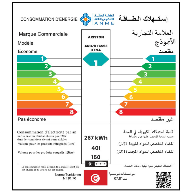 Système de Dégivrage : No Frost (Froid Ventilé) - Classe énergétique : 1 - Volume Net Totale : 617 Litres - Volume Net Totale : 551 Litres (Réfrigérateur : 401 Litres , Congélateur : 150 Litres) - Consommation d'énergie annuelle : 267 KWh - INVERTER : Non - Eclairage LED - Nombre d'étoiles congélateur : ★★★★ - Type d'affichage LED tactile (7 segments) – façade porte - 5 x étagères frigo en verre standard - Balconnets de porte 2 pleine largeur + 3 demi largeur - 1x Compartiments légumes grand bac - 2x Tiroirs congélateur - 3x Clayettes ajustables en hauteur - Étagère à œufs (1x6 œufs) - 1x Machine à glaçons - Capacité congélation : 7kg/24h - Capacité production glace : 1,5kg/24h - Niveau sonore : 37dB - Poids Net : 105 Kg - Dimensions (LxHXP) : 78,0 × 187,7 × 76,0 cm - Type de Gaz : R600a - Couleur : New Silver - Garantie 3 ans