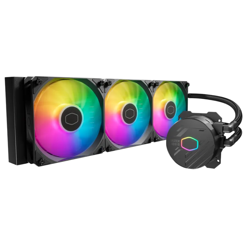 Kit de Watercooling Cooler Master MasterLiquid 360L Core ARGB - Couleur extérieure: Noir - Prise de processeur: Socket Intel LGA 1851/1700/1200, AMD AM5/AM4 - Matériau du radiateur: Aluminium - Dimensions du radiateur: 394x119.6x27.2 mm - Dimensions de la pompe: 81x76x47 mm - Pompe MTTF: 70000 heures - Niveau de bruit de la pompe: 12 dBA (Max) - Connecteur de pompe: 3 broches - Consommation électrique de la pompe: 3.96 W - Dimensions: 120x120x25 mm - 3x ventilateur - Type de LED du ventilateur: ARGB - Vitesse du ventilateur: 650-1750 tr/min ± 10 % - Flux d'air du ventilateur: 71.93 pi3/min (max) - Niveau de bruit du ventilateur: 27.2 dBA (Max) - Pression du ventilateur: 1.86 mmH₂O (Max) - Type de roulement de ventilateur: Roulement de carabine - MTTF du ventilateur: 160000 heures - Connecteur d'alimentation du ventilateur: 4 broches (PWM) - Taille du radiateur: 360 mm - Garantie 1 an