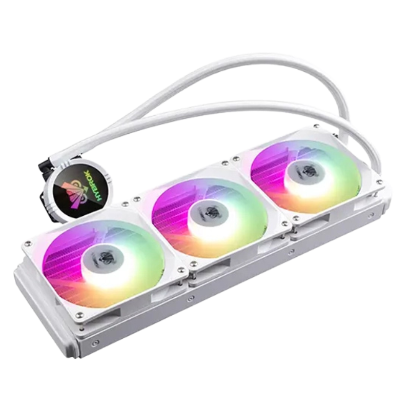 Watercooling HYBROK HL360B - Compatible avec Intel LGA 1851 / 1700 / 1200 / 115x | AMD AM4 / AM5 - Ventilateurs : 3x 120 mm avec éclairage ARGB adressable - Vitesse du ventilateur : jusqu’à 2000 tr/min - Pompe silencieuse et durable - Pompe : 0,36 A, 1500 à 2800 ± 10 % tr/min, roulement en céramique - Connecteur : 4 broches PWM (pompe), 3 broches ARGB (ventilateurs) - Niveau sonore : 35,2 dB(A) max - Dimensions du radiateur : 394 × 120 × 27 mm - Type de roulement de ventilateur : Roulement hydraulique - Couleur Blanc - Garantie 1 an
