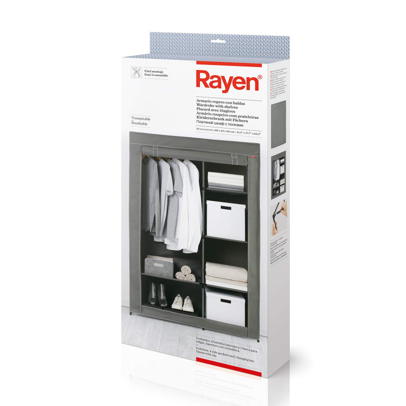 Placard avec étagères Rayen 2384.01 - Grande capacité de rangement - 6 étagères, une barre de ponderie et 4 poches extérieures - Idéal pour ranger tout type de vêtements Randonnée, accessoires, chaussures, draps, couvertures, serviettes… - Fermeture éclair: protège le contenu de la poussière, de la saleté et de la lumière - Porte pratique et fonctionnelle - Elle se nettoie facilement à l’aide d’un chiffon hummide - Structure métallique et résistante - Dimension: 105 x 45 x 161 cm - Garantie 1 an