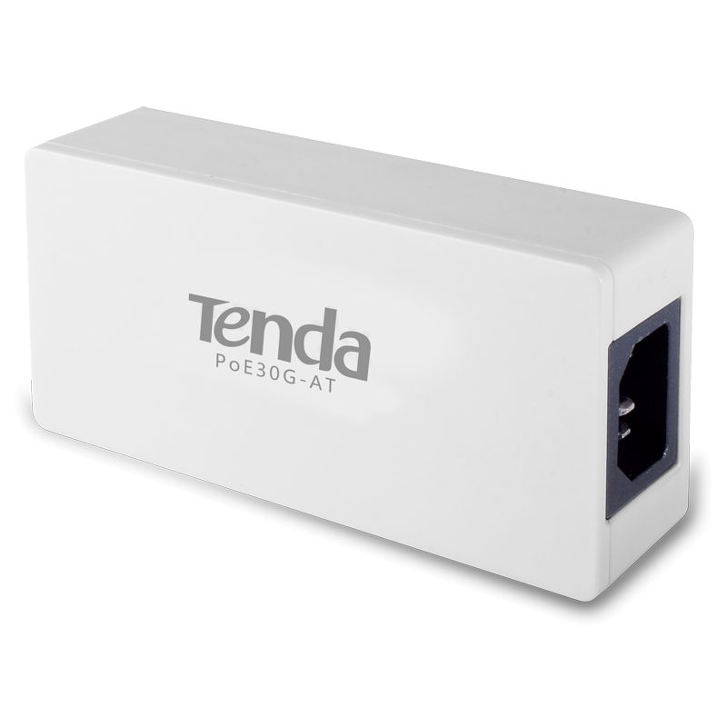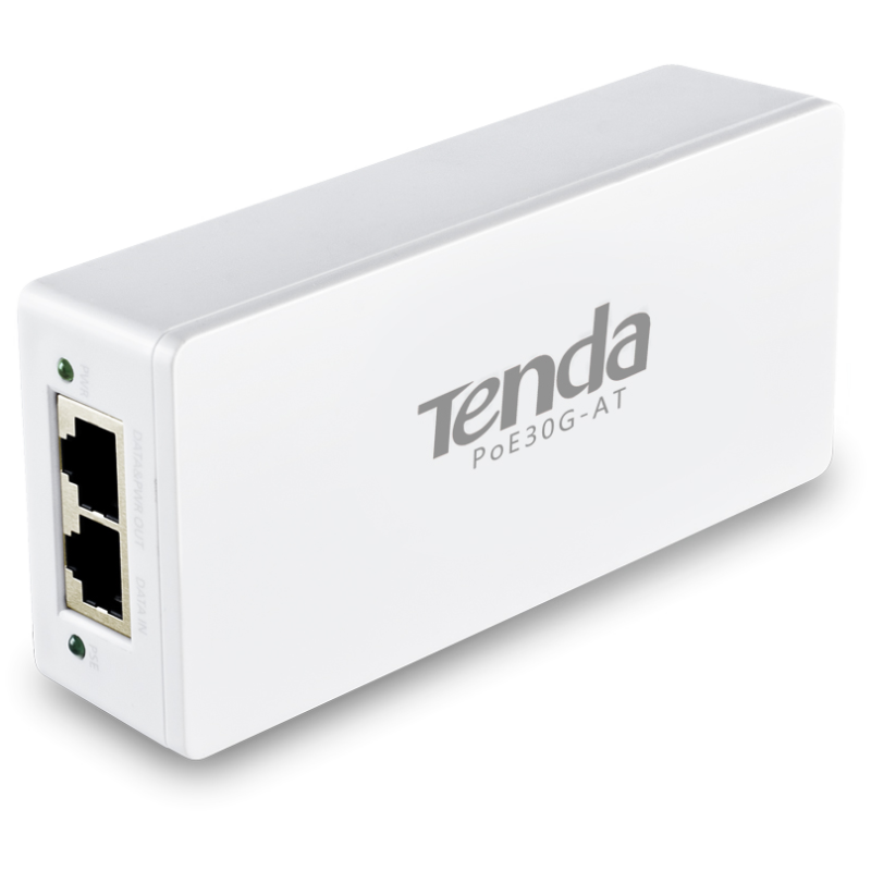 injecteur TENDA PoE AT Gigabit - Indicateur LED : PWR, PoE - Interfaces : Deux ports RJ-45, compatibles avec des débits de liaison de 10/100/1000 Mbps - Supports de transmission : Recommandé : CAT5/5e UTP ou supérieur - Mode de transfert : Stockage et transfert - Taux de transmission : 1000 Mbps - Budget PoE : Port unique : AF : 15,4 W, AT : 30 W - Consommation d'énergie 30 W - Montage sur bureau - Port PoE fournissant une alimentation jusqu'à 100 mètres - Température de fonctionnement : 0℃~45℃ - Dimension : 132,3 mm × 60 mm × 33 mm - Tension : 100-240 V CA 50/60 Hz - Certification : FCC, CE, RoHS, UL - Plug and Play, aucune configuration requise - Couleur Blanc - Garantie 1 an
